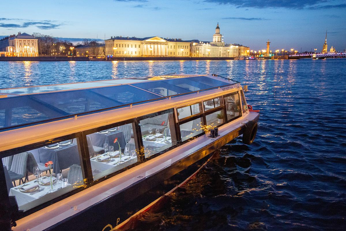 Панорамные окна и стеклянная крыша открывают завораживающий вид на Северную столицу, которым особенно приятно любоваться ночью. Чтобы вы чувствовали себя комфортно в любое время суток, на борту установлен климат-контроль.