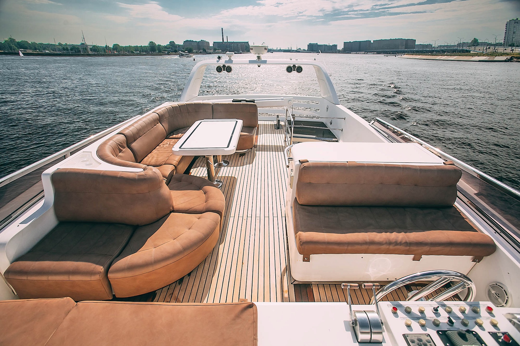 Каждая деталь на борту пропитана изысканностью: отделка из благородного дерева, просторный флайбридж и уютный салон с мягкими диванами и стильными столиками. Для вашего удобства на борту предусмотрена кухня с современной техникой, качественная аудиосистема с Bluetooth, а также два гальюна и уютные теплые пледы для прохладных вечеров.