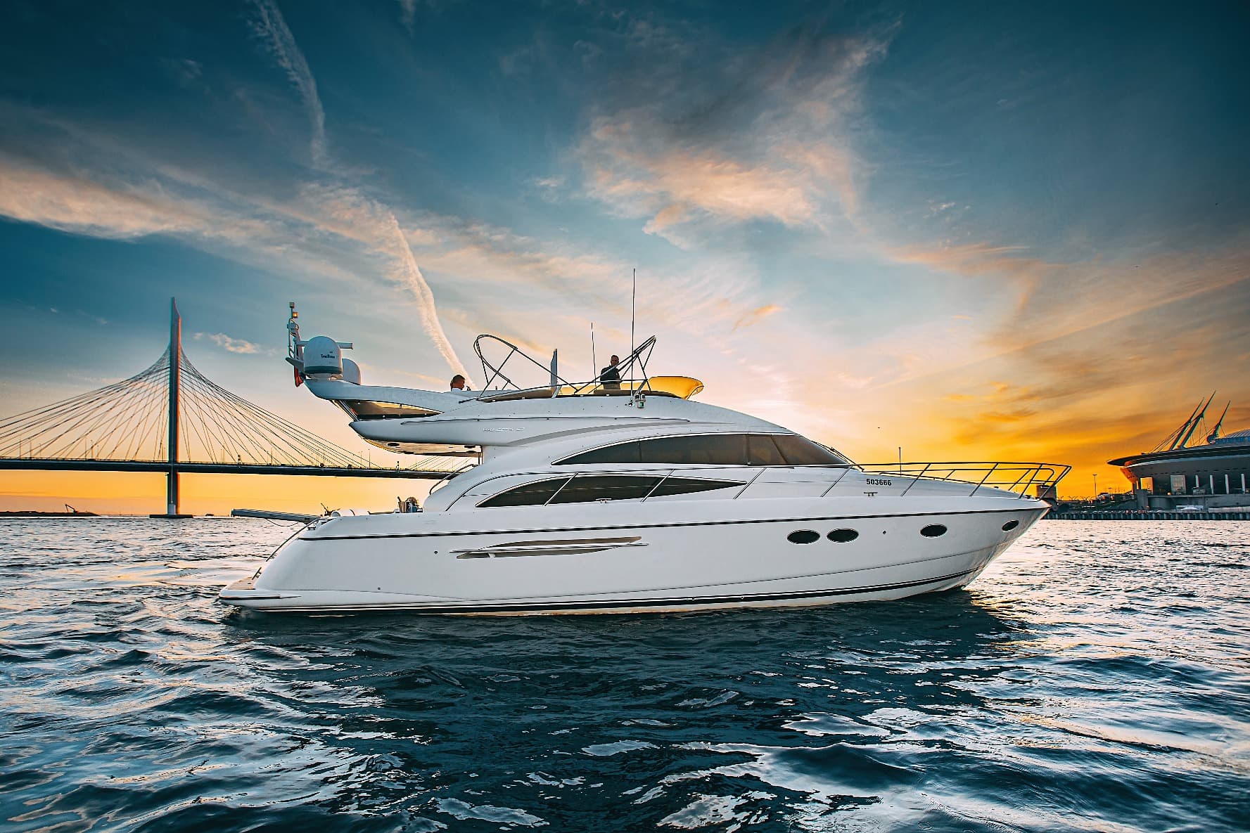 Флайбридж с шезлонгами для загара и открытая зона с диванами и столиками на втором уровне позволят насладиться свежим воздухом и шикарными видами на набережную Санкт-Петербурга. Для вашего удобства на борту оборудованы 2 уборные, душ, уютные каюты, бар, кухня, а также аудиосистема с поддержкой Bluetooth и телевизор. Все продумано до мелочей: теплые пледы, чай, кофе и питьевая вода для всех гостей.
