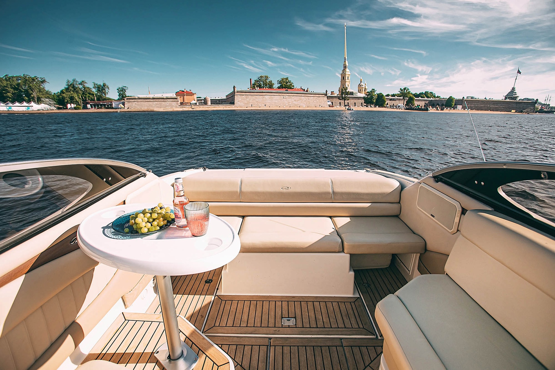 Крытый салон с обогревом и мягкими тёплыми пледами создаст уютную атмосферу даже в прохладные дни, а мощная аудиосистема с Bluetooth позволит наслаждаться любимой музыкой на фоне живописных видов. Тент от солнца и непогоды сделает поездку комфортной в любую погоду, а бокалы и уютные зоны отдыха подойдут для душевного отдыха в кругу близких.
