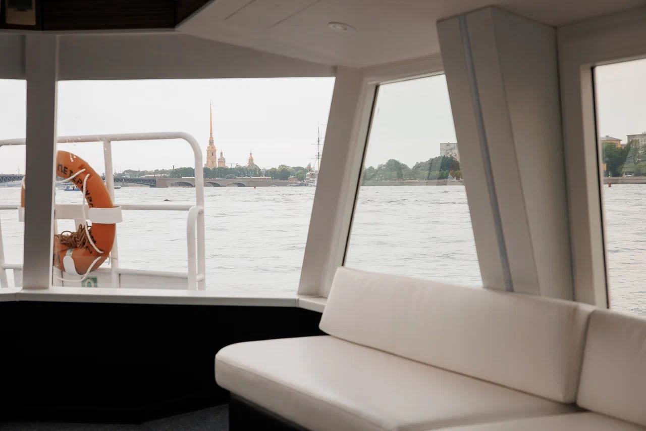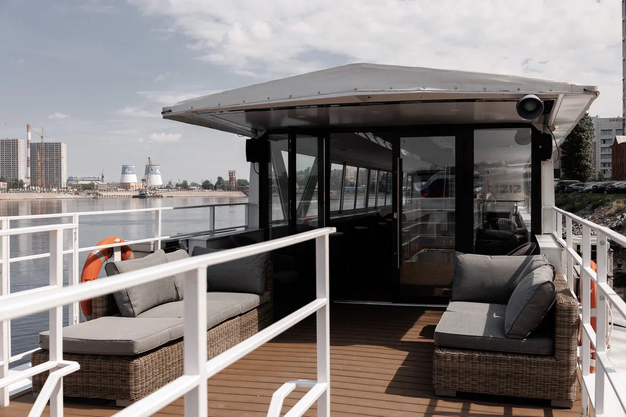 Этот теплоход уникален тем, что является единственным судном в Петербурге, оснащенным большим ЖК-экраном, а также ночной подсветкой и музыкальной системой. Для удобства гостей на борту находятся две туалетные комнаты в кормовой части и камбуз с мангалом.