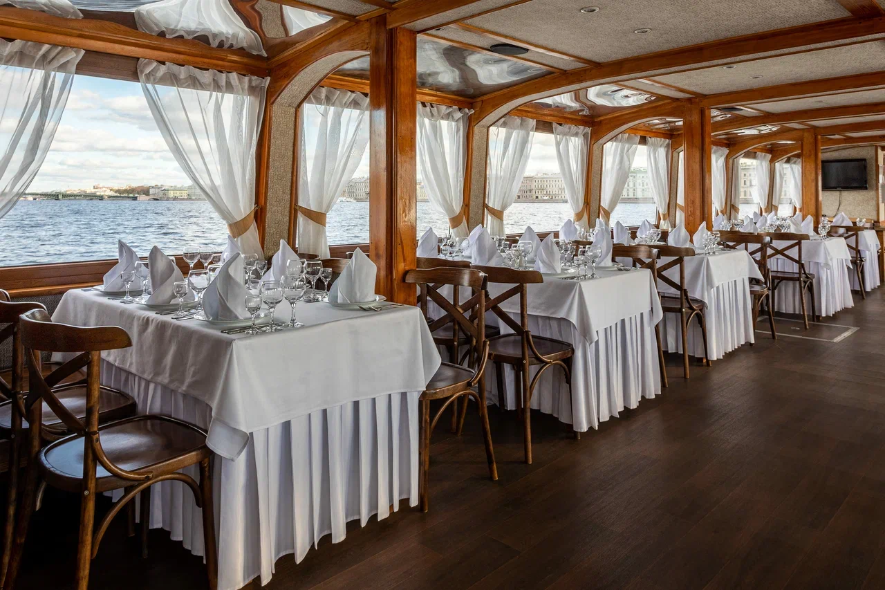 Большой и просторный зал, расположенный на нижней закрытой палубе, оформлен в светлых песочных тонах с отделкой из дерева, что придает интерьеру особый шарм и уют. По желанию клиента зал может быть оформлен в соответствии с тематикой мероприятия, что поможет создать тем самым неповторимую атмосферу праздника.