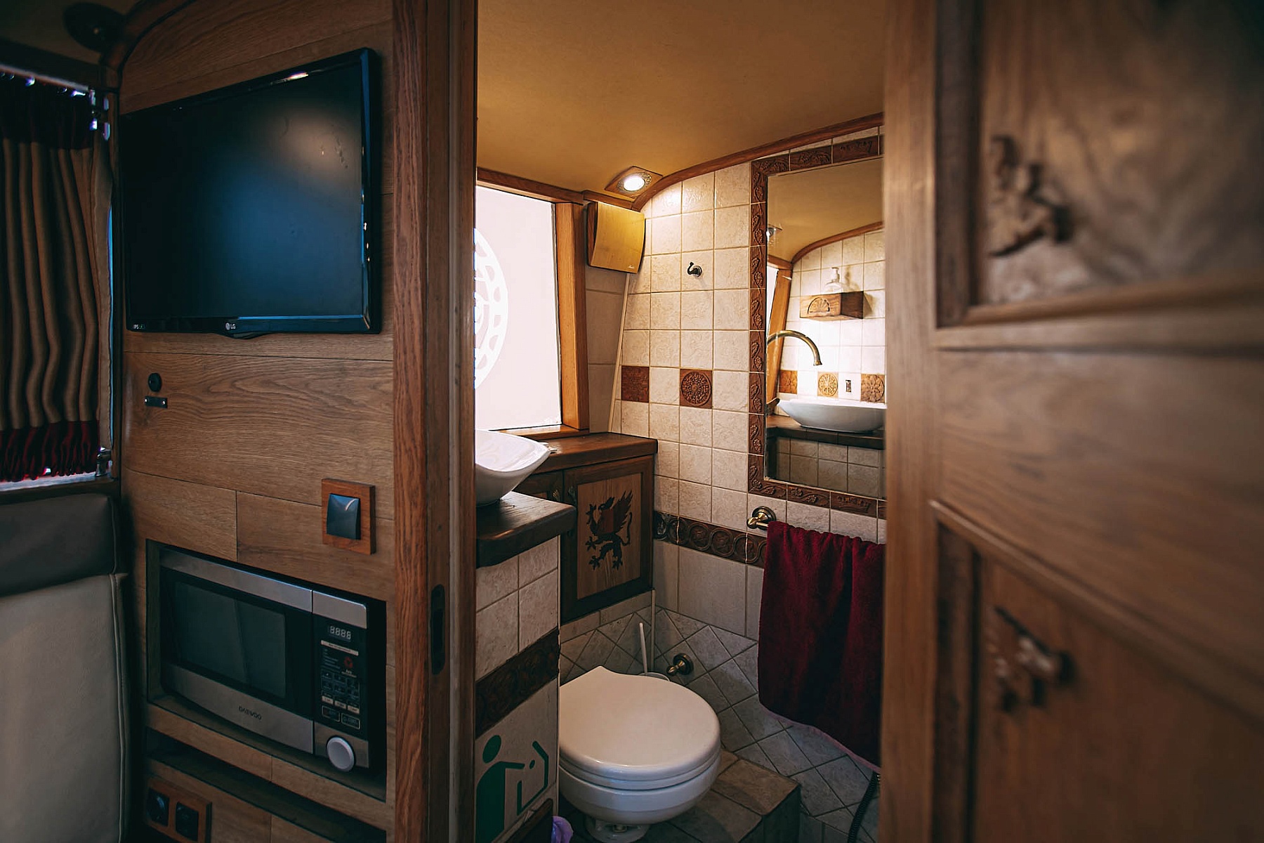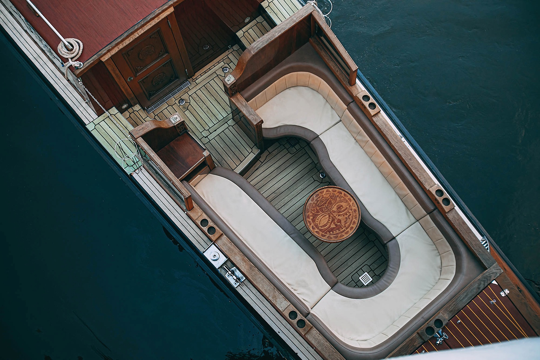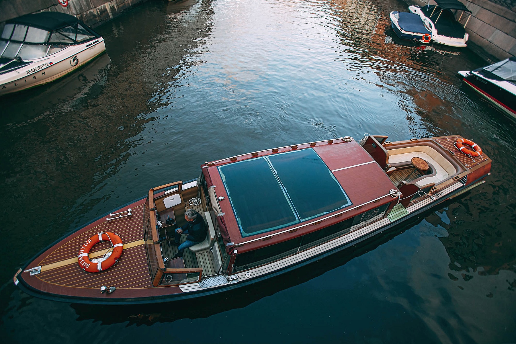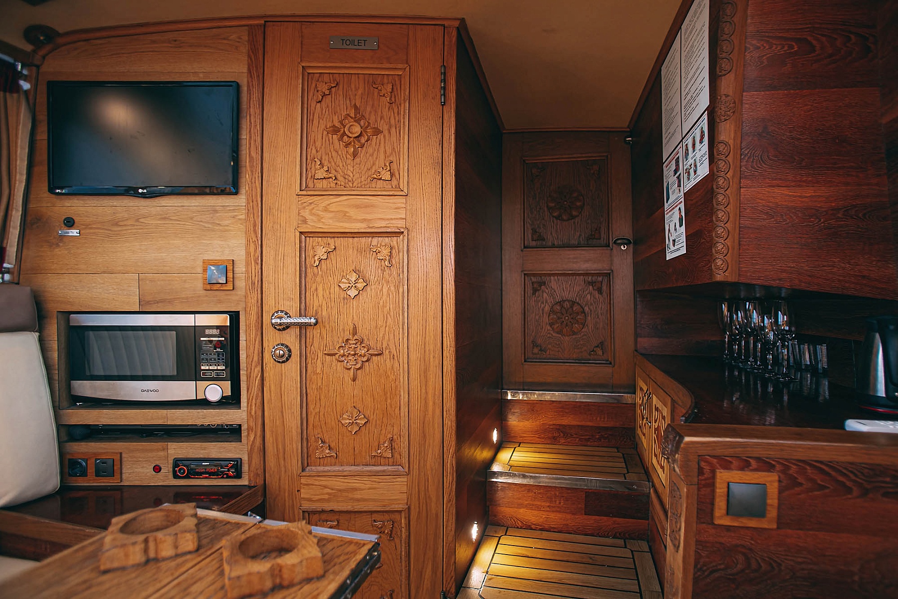 Крытый салон с кожаной мебелью позволит насладиться поездкой в любую погоду. Внутри катера есть мини-кухня для приготовления закусок, удобная уборная, а также система кондиционирования и отопления, что обеспечит комфортный отдых при любой температуре. Для развлечений на борту предусмотрен телевизор с караоке и мощная аудиосистема. Теплые пледы согреют гостей в прохладную погоду.